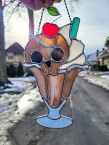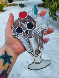 Original stained glass piece featuring a skull shaped ice cream sundae.