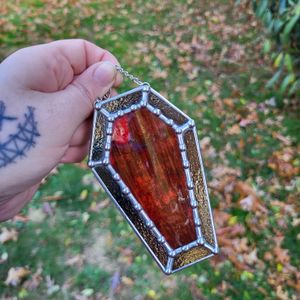 This stained glass piece is made using the traditional Tiffany Technique. It involves hours of design work, cutting and grinding glass to fit the design, adding copper foil to all the edges of each glass piece, soldering the pieces together, and then cleaning and polishing to a shiny perfection.